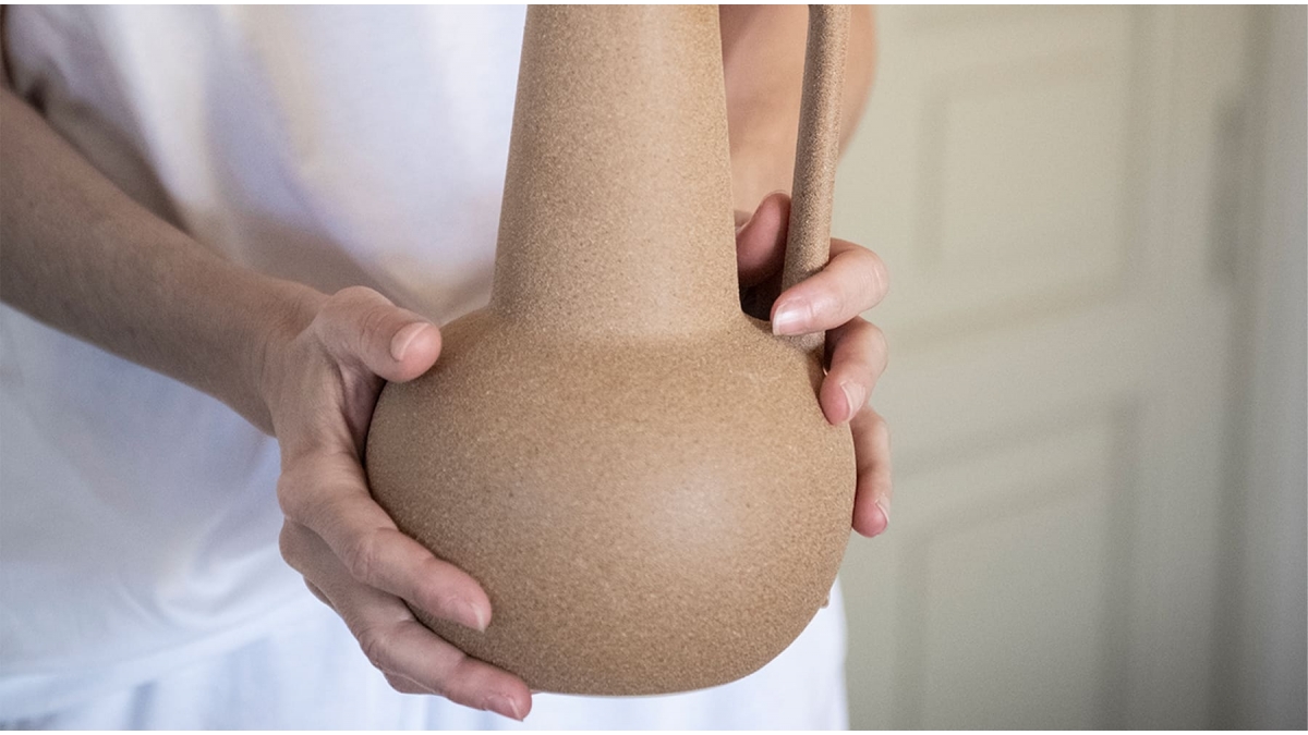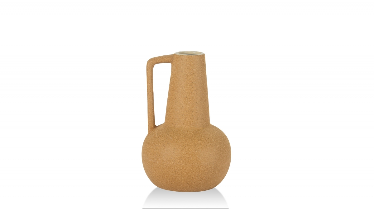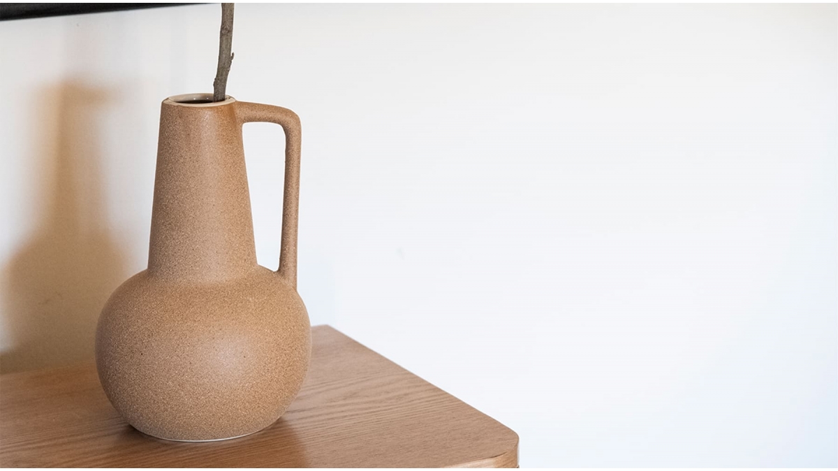 Ce vase en céramique présente une finition irrégulière avec une texture granuleuse. Cette pièce d'inspiration africaine dispose de 4 anses symétriques. Il se prête à la décoration de table.