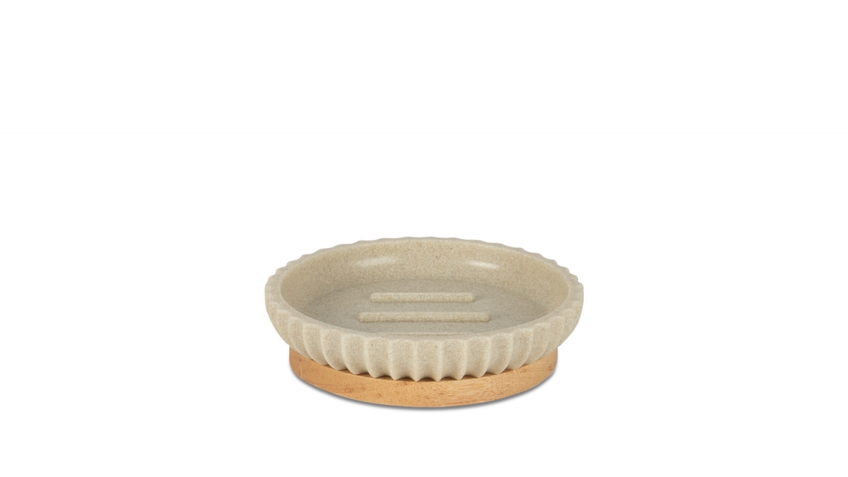 Aménagez votre salle de bains avec soin grâce à ce porte savon à effet strié. Son socle en bois complète une structure en résine beige élégante.