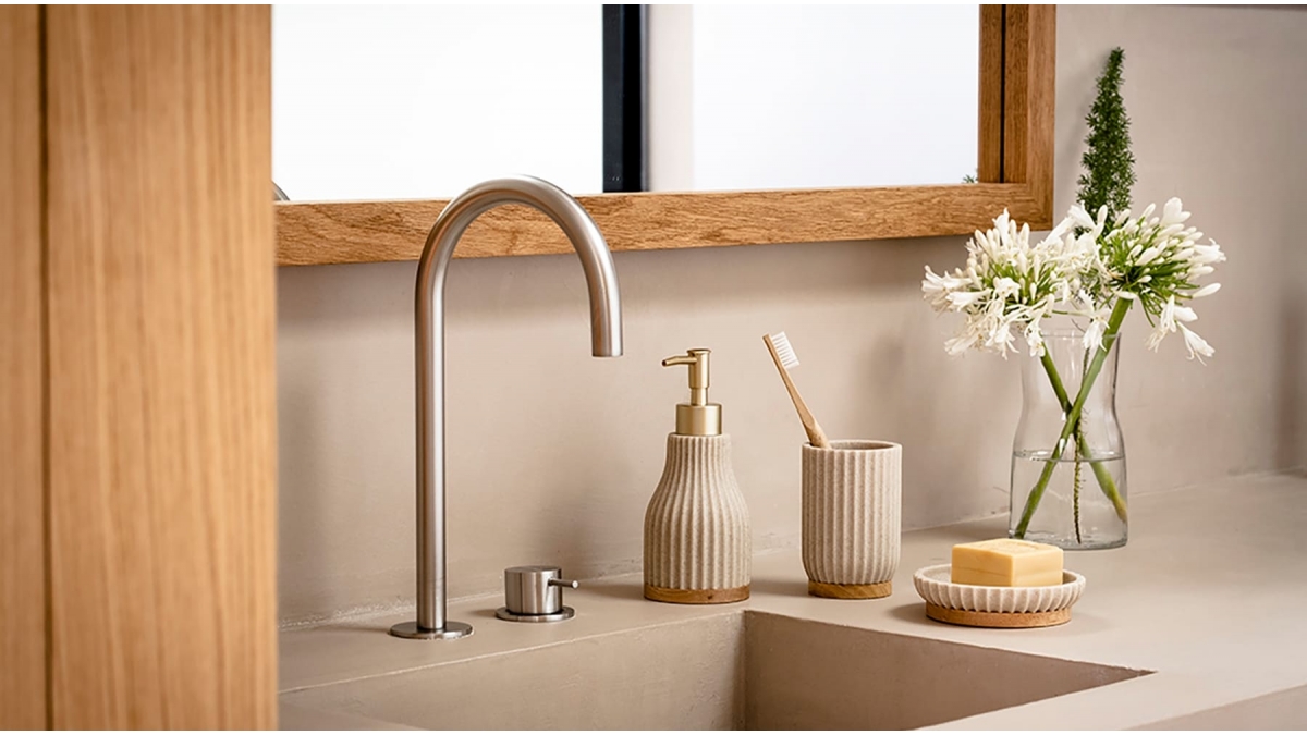 Ce distributeur à savon de la collection OCEANO est la touche décorative pratique et élégante. Sa résine beige à effet strié est accompagné d'un socle en bois.
