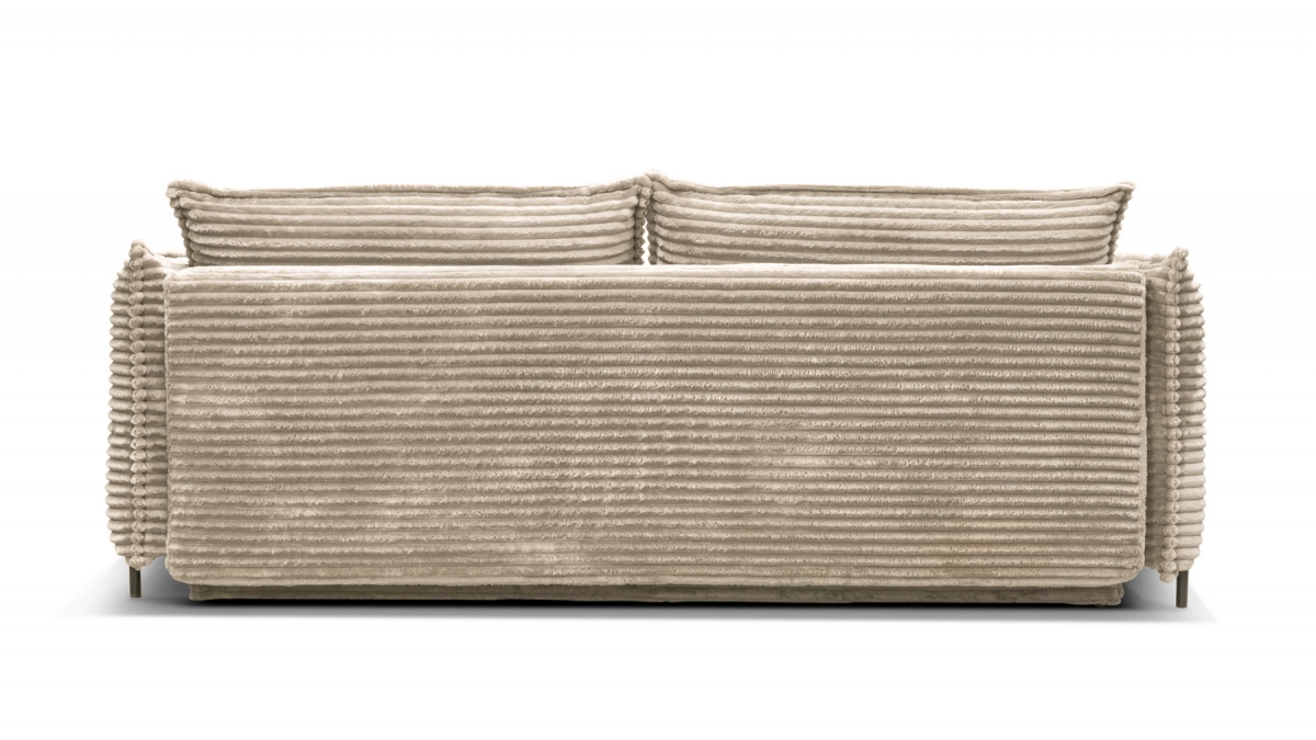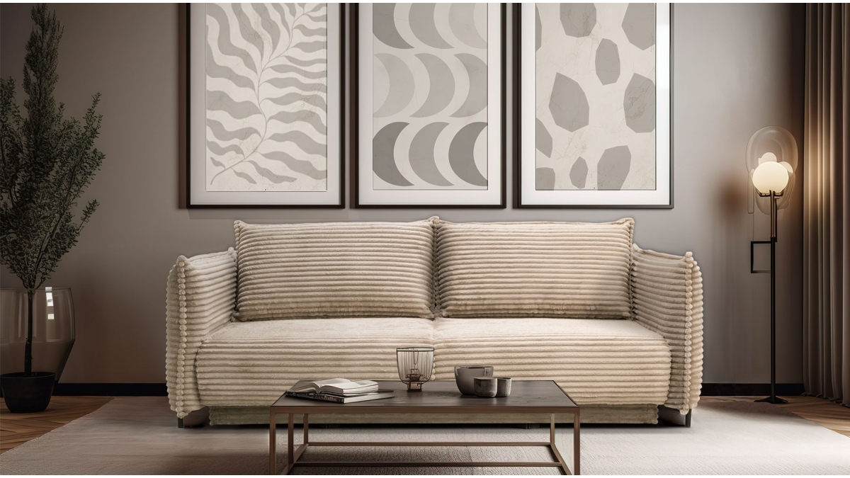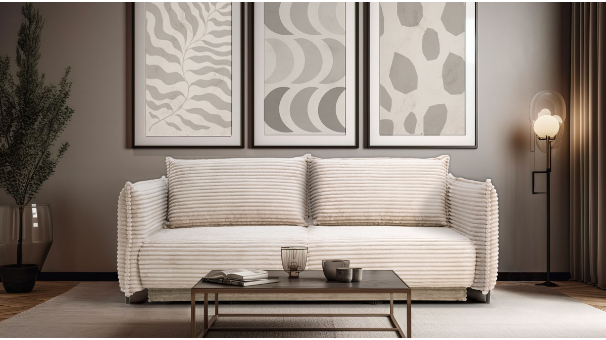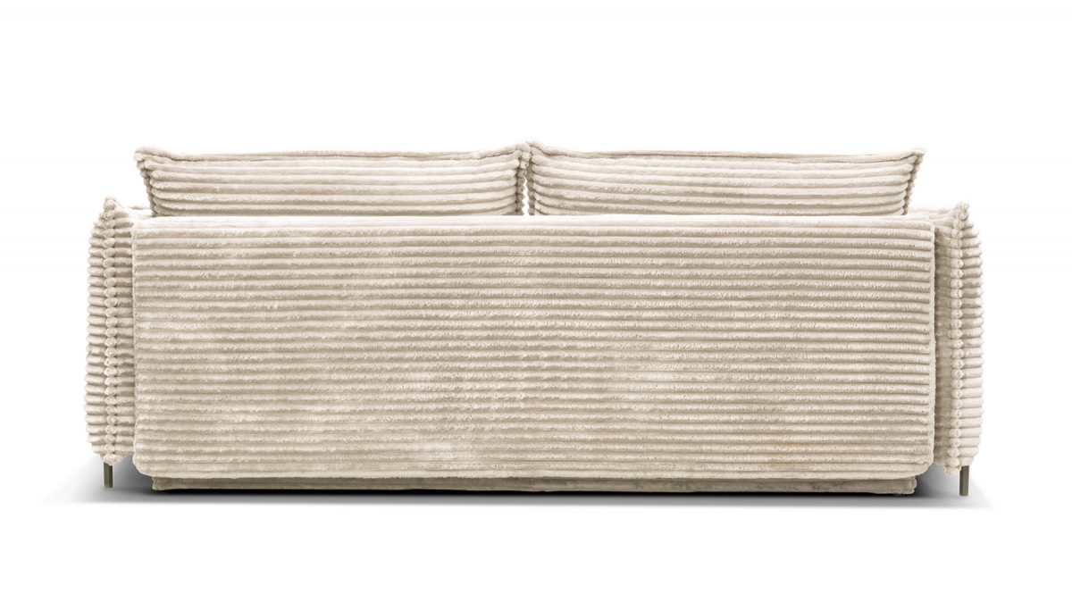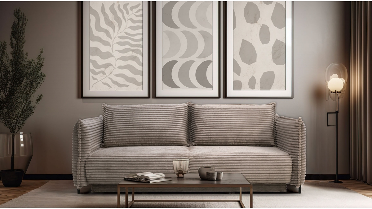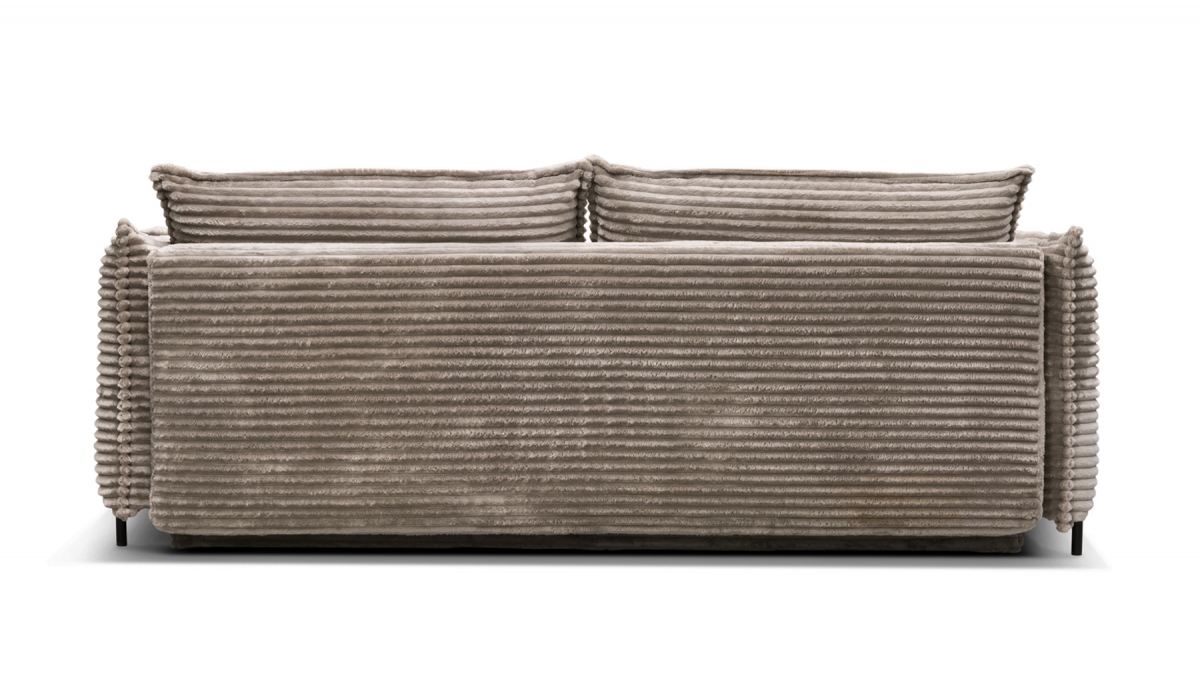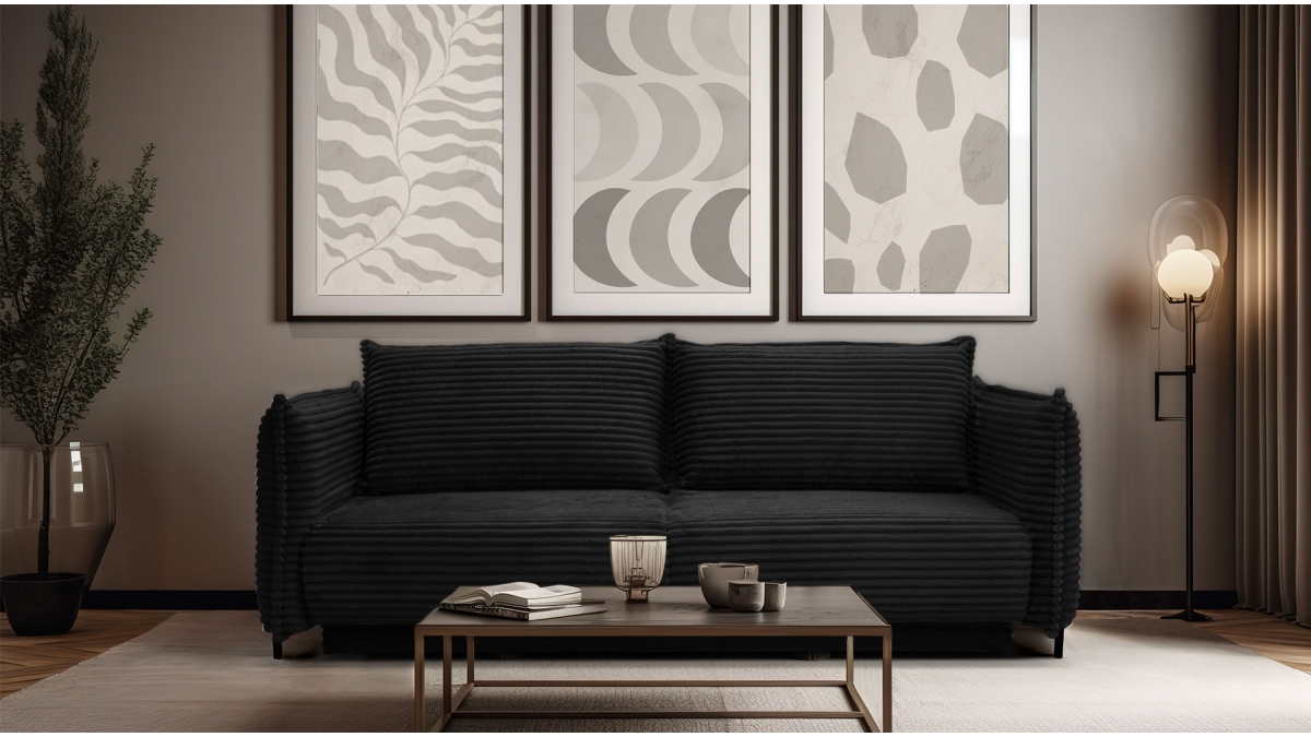 Rendez votre salon incontournable en craquant pour le canapé convertible en velours côtelé Sorrento. Son design balance entre les accoudoirs fins et très droits, l’assise large et confortable et le dossier aux coussins légèrement inclinés. Ce canapé 3 places joue aussi bien sur le plan esthétique que pratique : en quelques secondes, transformez-le en couchage deux places idéal pour recevoir ou vous détendre.