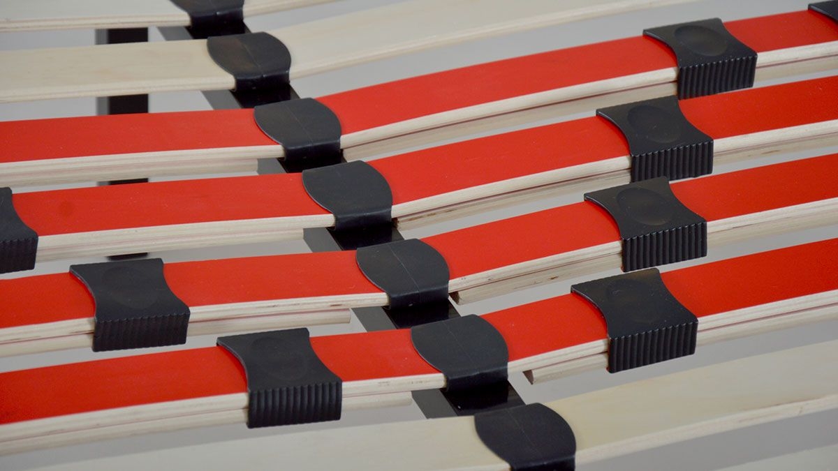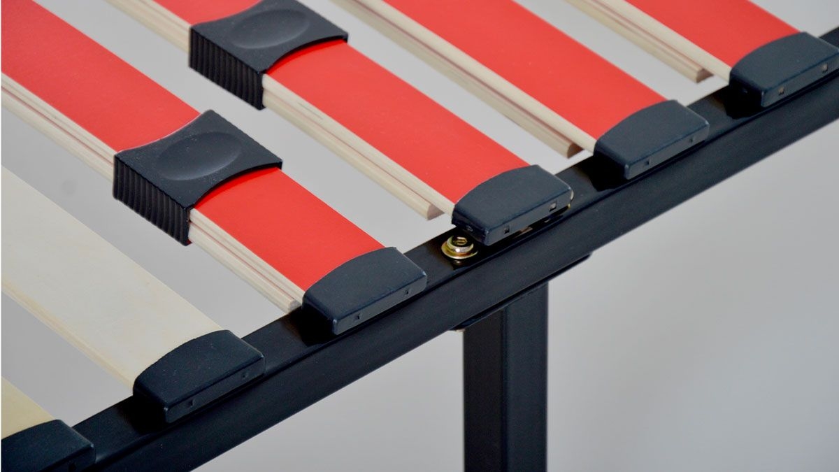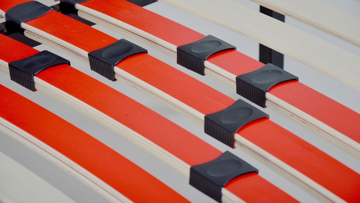 Sommier | Lattes | ▸ 18 lattes en peupliers pour les simples couchages avec 4 lattes rouges et 4 curseurs ajustables | 2×18 lattes pour les doubles couchages avec 2x4 lattes rouges et 16 curseurs ajustables |