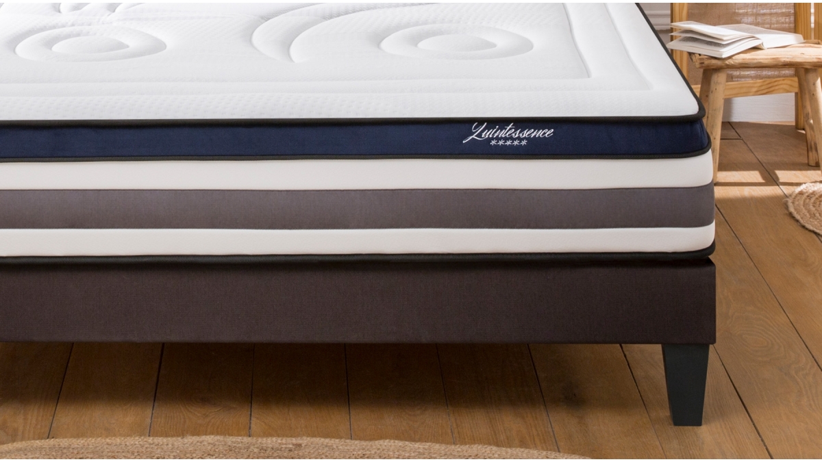 Le rêve absolu pour tous les rêveurs, le matelas Quintessence est le matelas cocooning par excellence. Cet ensemble comprend un sommier à lattes tissu gris anthracite.