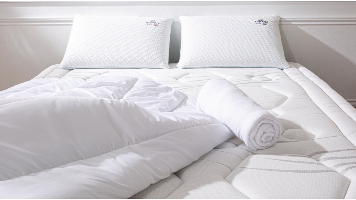 Caractéristiques du pack Accessoires | ▸ 1 protège matelas adapté à la dimension du matelas et 90x190/200 cm : 1 oreiller, 1 couette 140x200 cm - 140x190/200 cm : 2 oreillers, 1 couette 200x200 cm - 160x200 cm : 2 oreillers, 1 couette 220x240 cm - 180x200 cm : 2 oreillers, 1 couette 240x260 cm |