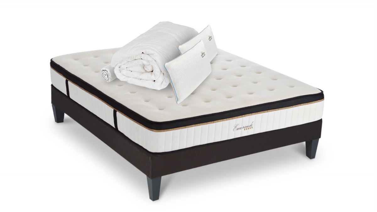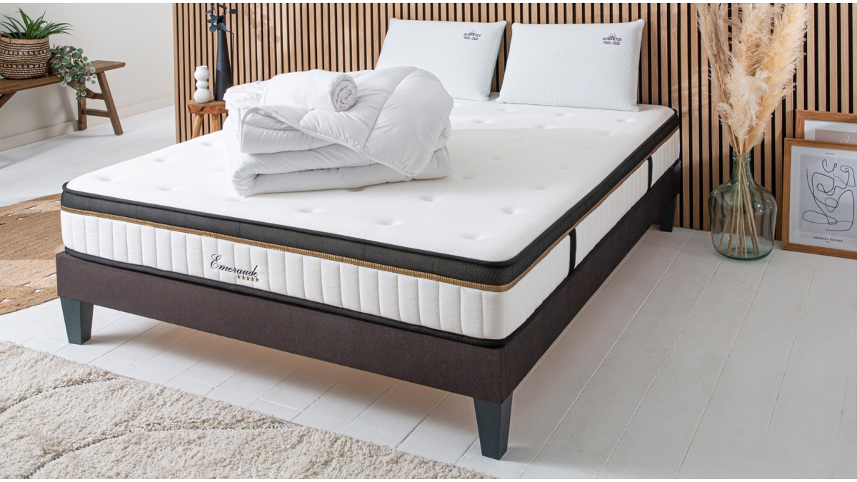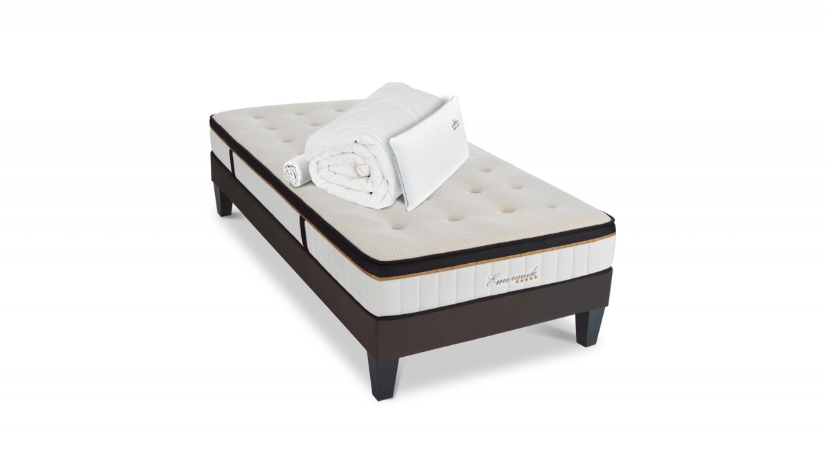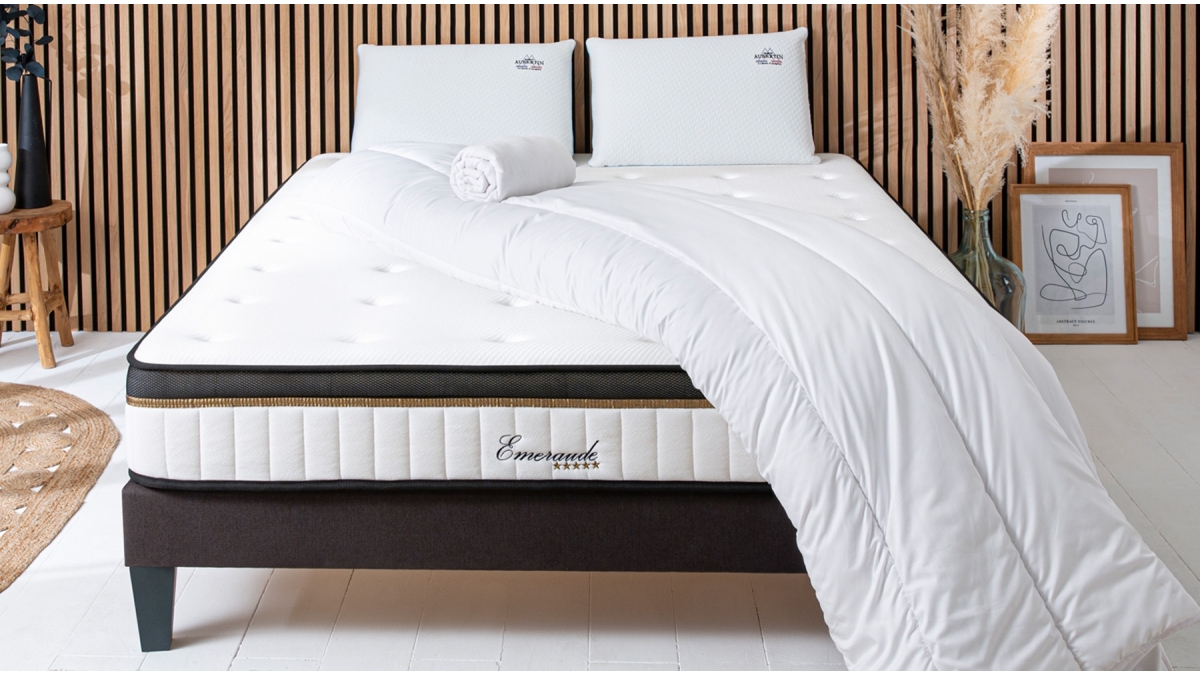 Caractéristiques du pack Accessoires | ▸ 1 protège matelas adapté à la dimension du matelas et 90x190/200 cm : 1 oreiller, 1 couette 140x200 cm - 140x190/200 cm : 2 oreillers, 1 couette 200x200 cm - 160x200 cm : 2 oreillers, 1 couette 220x240 cm - 180x200 cm : 2 oreillers, 1 couette 240x260 cm |
