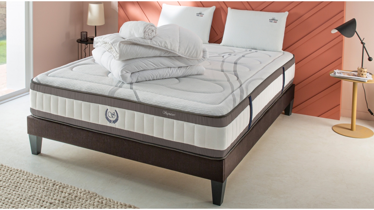 Caractéristiques du pack Accessoires | ▸ 1 protège matelas adapté à la dimension du matelas et 90x190/200 cm : 1 oreiller, 1 couette 140x200 cm - 140x190/200 cm : 2 oreillers, 1 couette 200x200 cm - 160x200 cm : 2 oreillers, 1 couette 220x240 cm - 180x200 cm : 2 oreillers, 1 couette 240x260 cm |