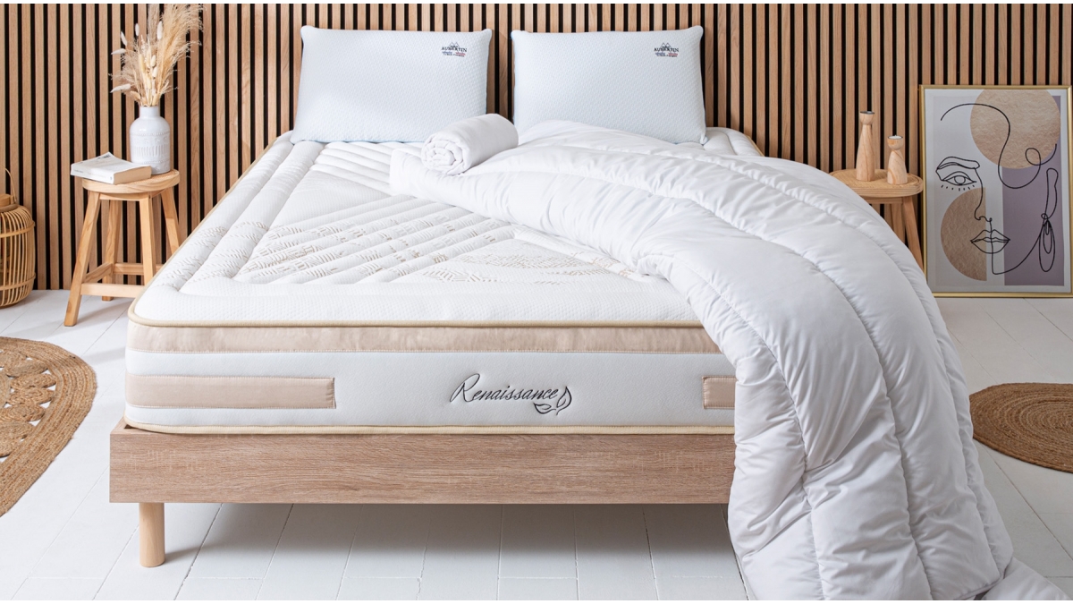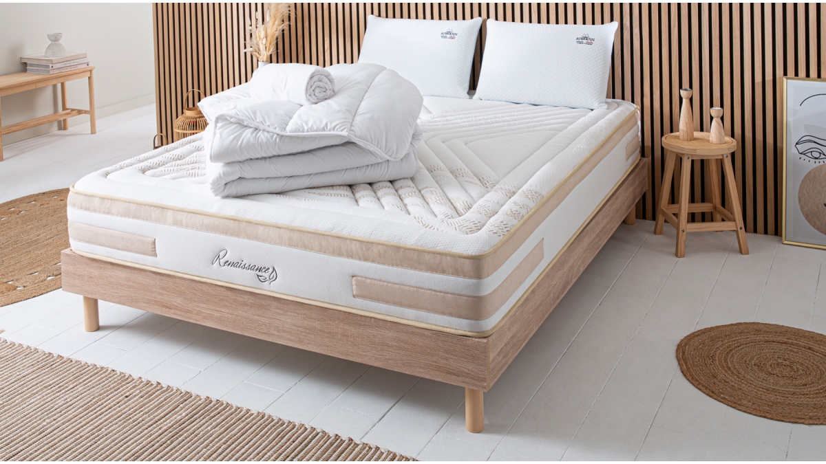 Caractéristiques du pack Accessoires | ▸ 1 protège matelas adapté à la dimension du matelas et 90x190/200 cm : 1 oreiller, 1 couette 140x200 cm - 140x190/200 cm : 2 oreillers, 1 couette 200x200 cm - 160x200 cm : 2 oreillers, 1 couette 220x240 cm - 180x200 cm : 2 oreillers, 1 couette 240x260 cm |