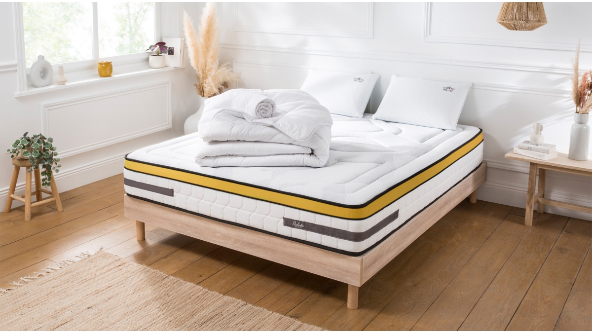 Caractéristiques du pack Accessoires | ▸ 1 protège matelas adapté à la dimension du matelas et 90x190/200 cm : 1 oreiller, 1 couette 140x200 cm - 140x190/200 cm : 2 oreillers, 1 couette 200x200 cm - 160x200 cm : 2 oreillers, 1 couette 220x240 cm - 180x200 cm : 2 oreillers, 1 couette 240x260 cm |